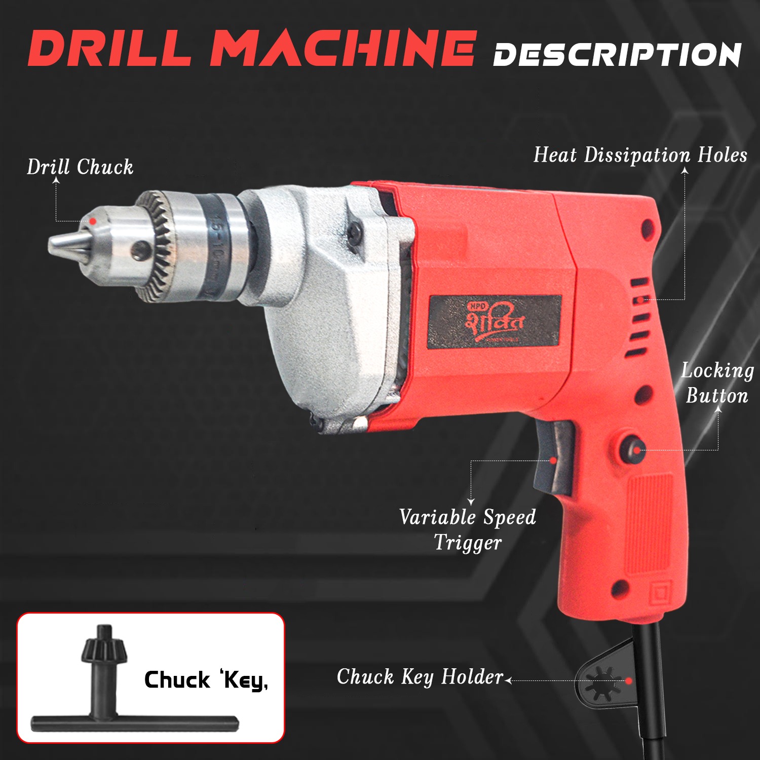 Introducing the HPD 350W Electric Drill Machine, a compact yet powerful tool designed for precise drilling in wood, metal, plastic, and more. With a high-performance copper motor and 10mm key chuck, this drill is perfect for both home improvement projects and light professional work.