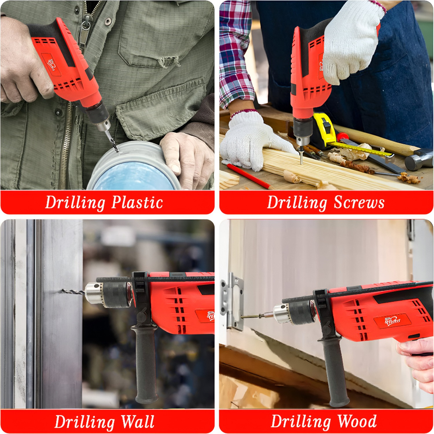 With a full copper motor, the drill is built for longevity and consistent power, while the speed control feature allows for precise adjustments, making it ideal for both heavy-duty and delicate tasks. The ergonomic design ensures comfort during extended use, while the included accessories, such as drill bits, a PH2 screw bit, and safety gloves, make it a complete solution for your drilling needs.
