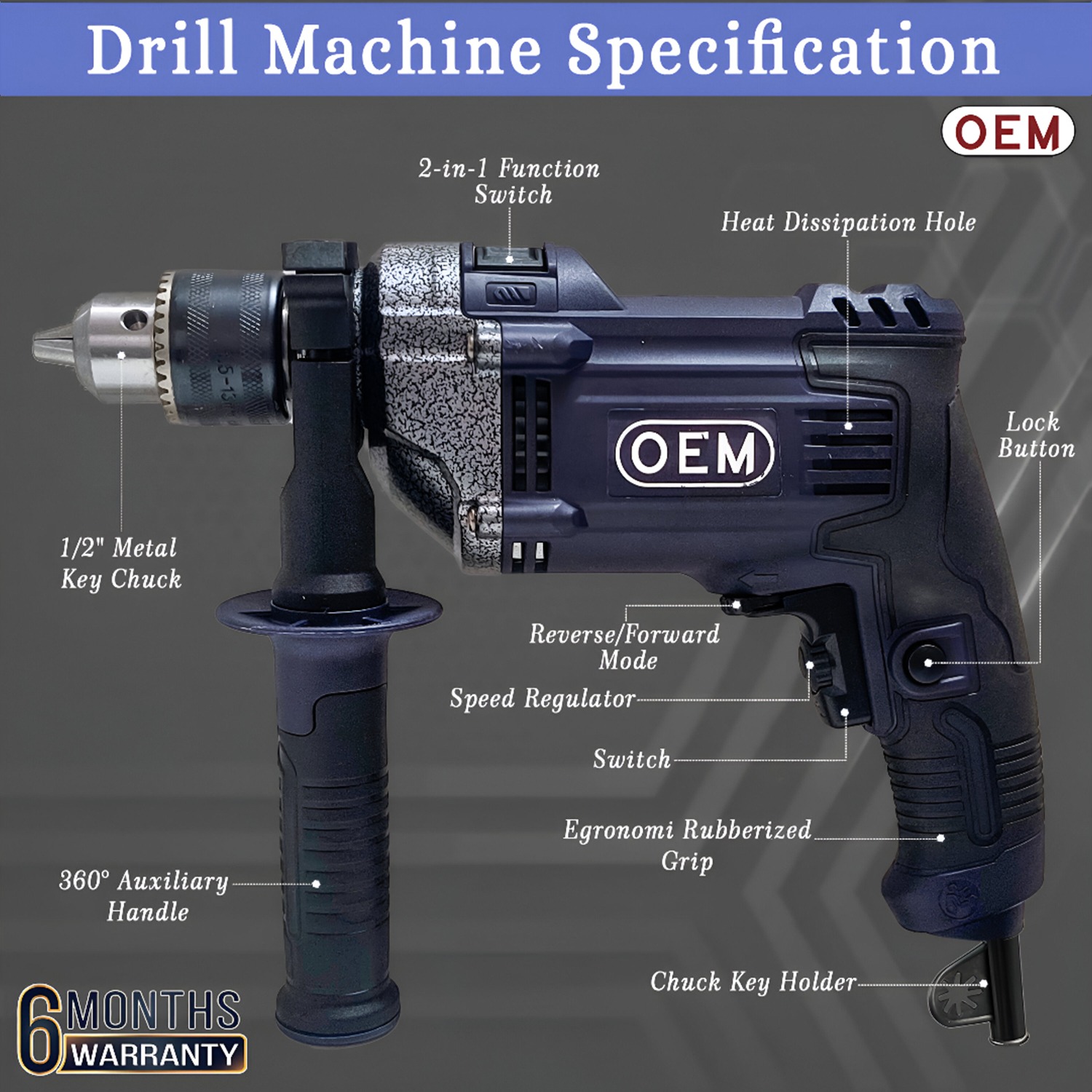 Get the job done with precision and ease using the OEM 13mm Impact Drill 810W Professional. With a powerful 810W full copper motor and a speed of 2800 RPM, this versatile drill is perfect for tackling tough tasks on wood, metal, concrete, and masonry. Its advanced features, including speed control, impact/drill mode, and a durable metal head, make it a reliable tool for both professionals and DIY enthusiasts.