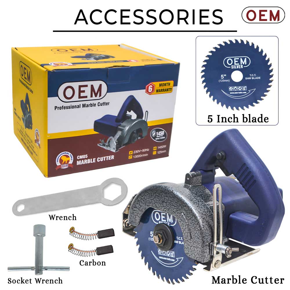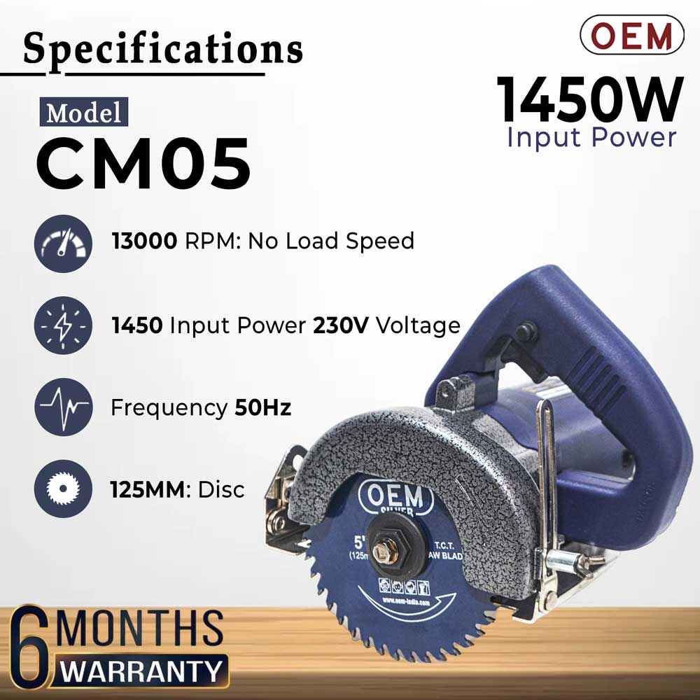 Using the OEM 1450W 5 Inch Marble Cutter (CM05) for regular site work and the performance is quite good. The machine has strong power and the 13,000 RPM speed helps in fast and clean cutting. Build quality feels solid and suitable for professional use.