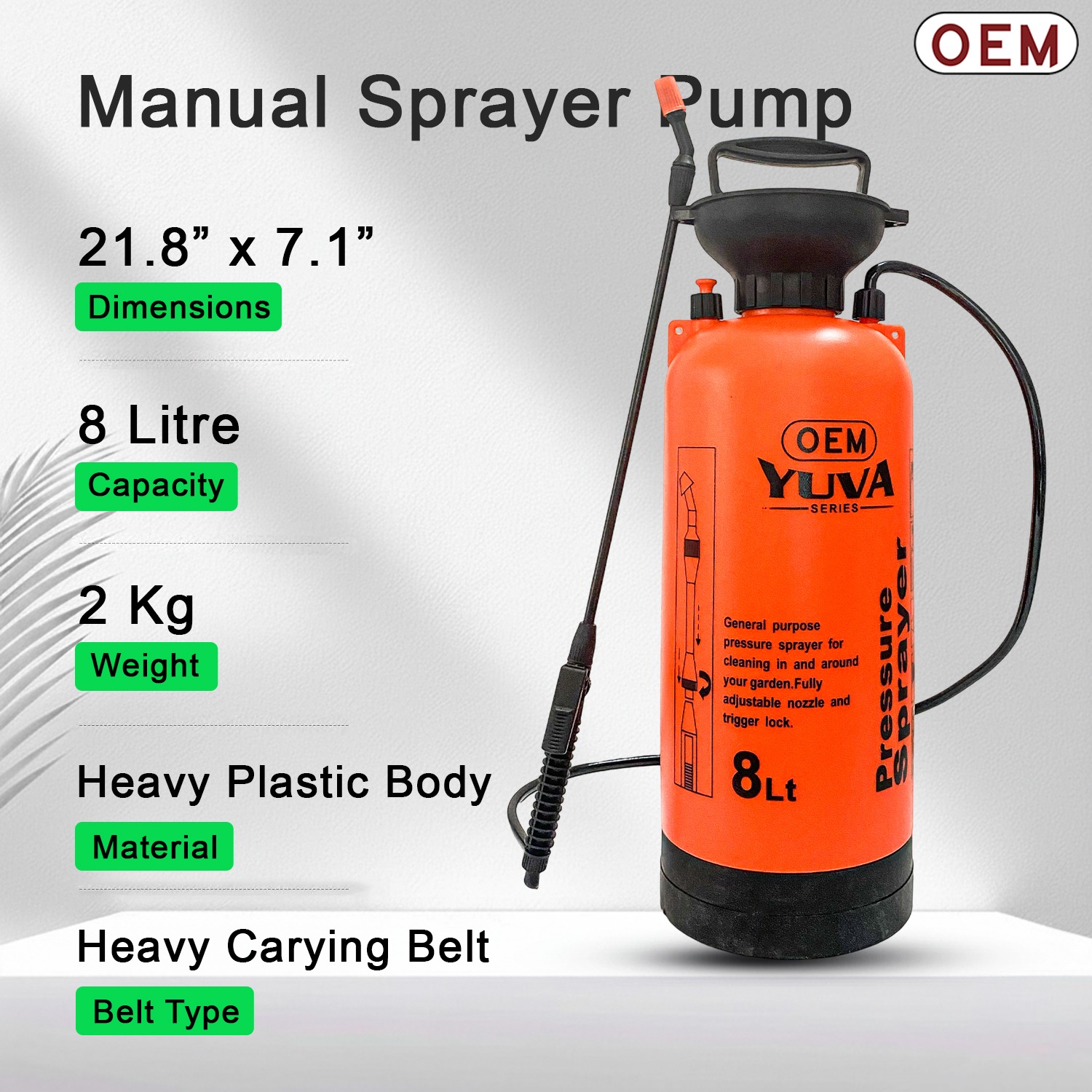 Take care of your garden, crops, or outdoor areas with ease using the OEM 8L Manual Multipurpose Garden Sprayer. Built for everyday spraying tasks, this sprayer is ideal for applying pesticides, herbicides, fertilizers, and water. Its user-friendly hand-pump design and durable construction make it a reliable choice for farmers, gardeners, and cleaning professionals alike.