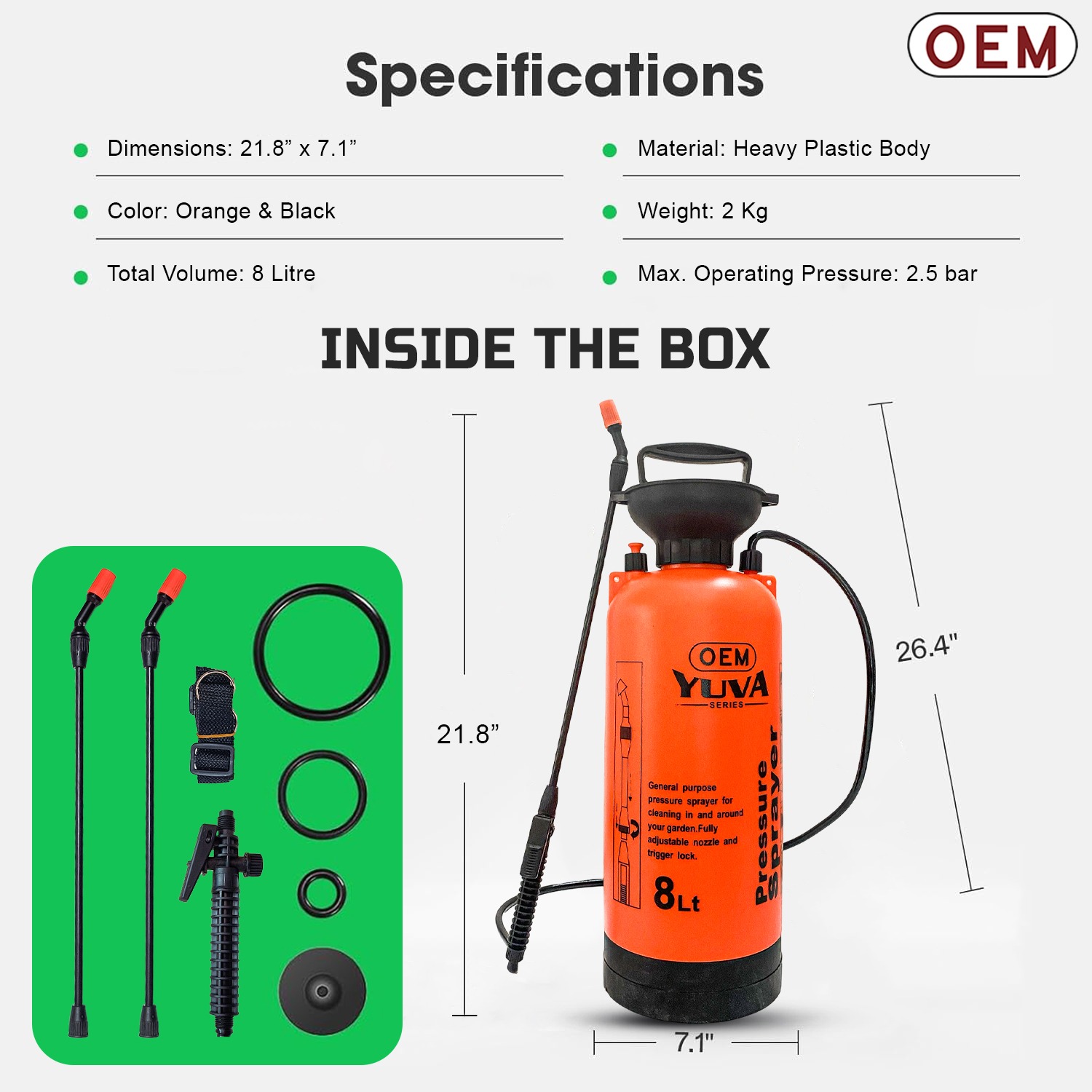 - 8L Tank Capacity Sufficient for medium to large garden areas or extended spraying tasks.