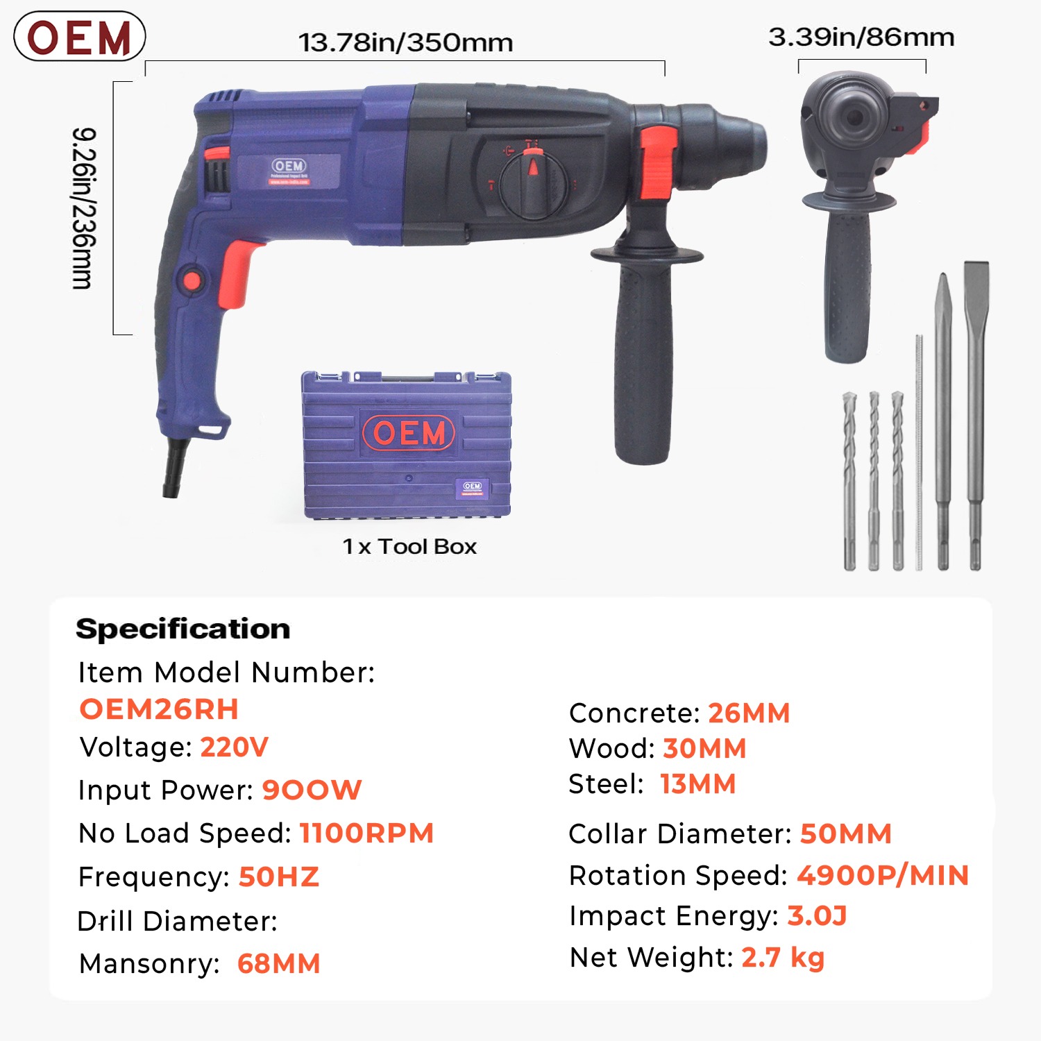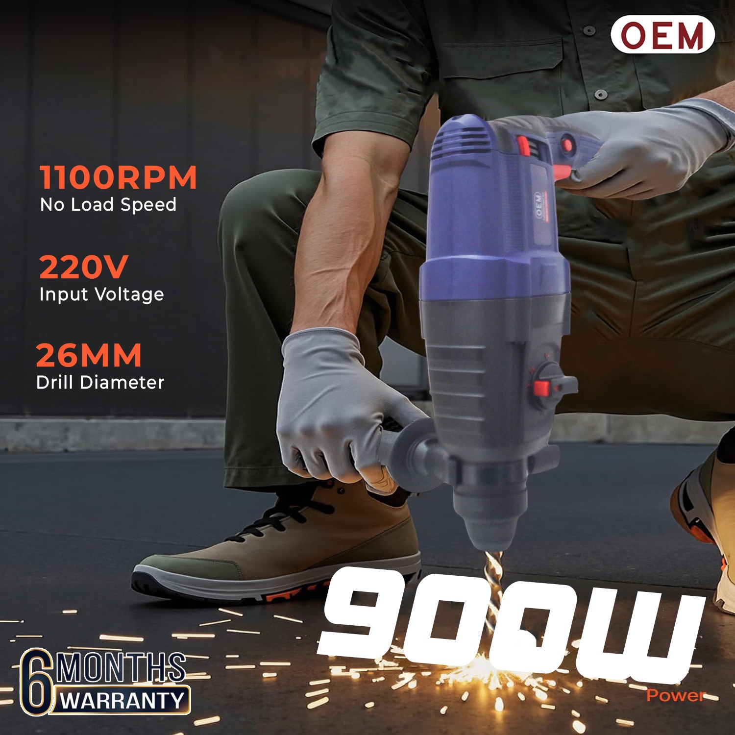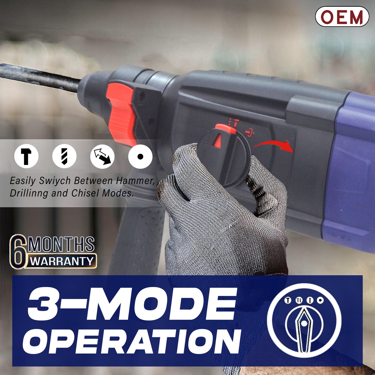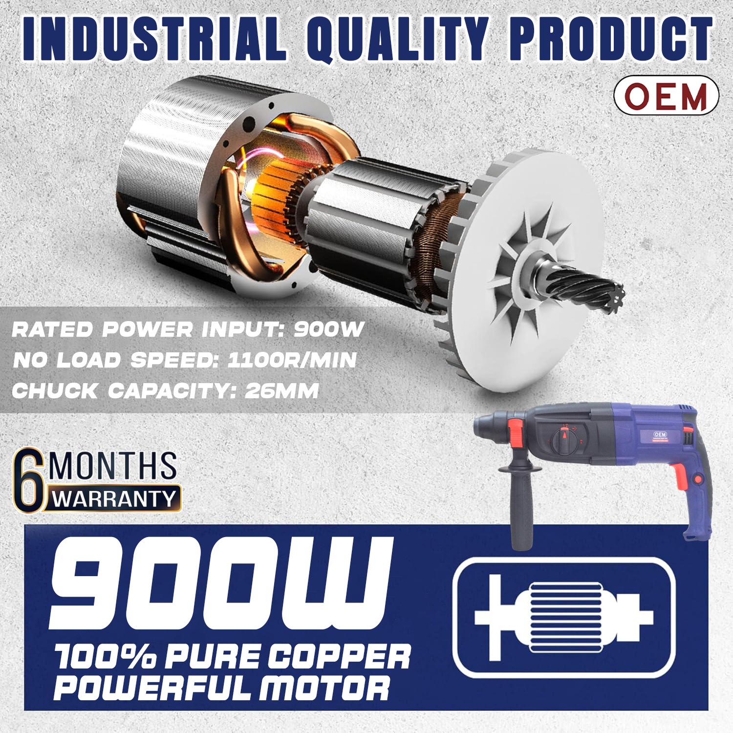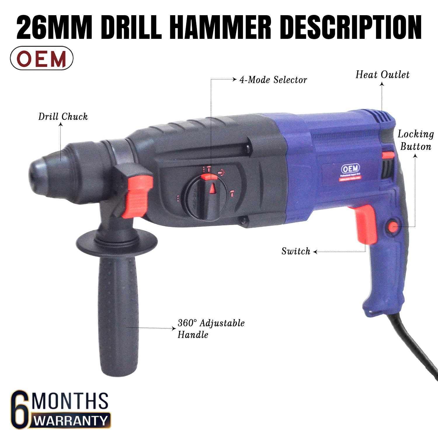 OEM Professional 26MM Rotary Hammer With 6 MONTHS Warranty 900 Watt 3 Mode Function Heavy Copper Motor R/F with Free 3 Drill bits and Two Chisel